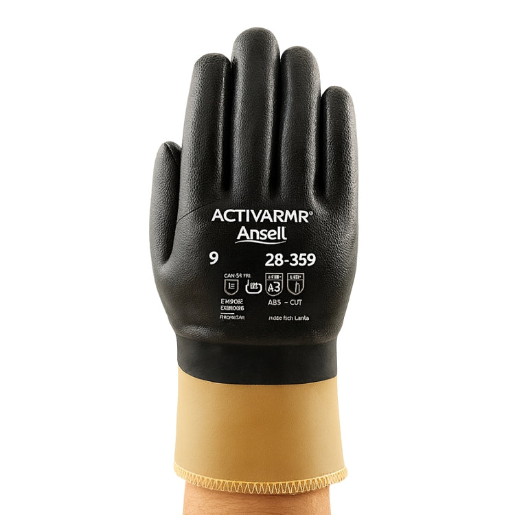 Luva de segurança confeccionada em raspa, com reforço interno em tecido térmico de Grafatex de algodão, com uma tira de raspa entre o polegar e o indicador.