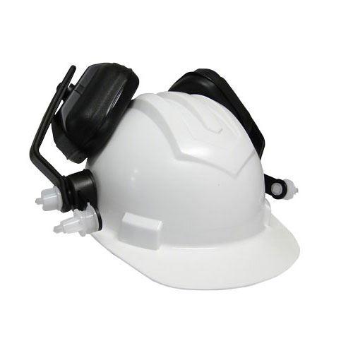 Abafador de ruídos tipo concha, MARK V, composto de duas conchas plásticas, preenchidas internamente com espuma absorvedora de ruídos e externamente na área de contato com o ouvido, selos ou almofadas de vinil com espuma para selagem e conforto. As conchas são montadas e articuladas em um suporte tipo arco fabricado em plástico.