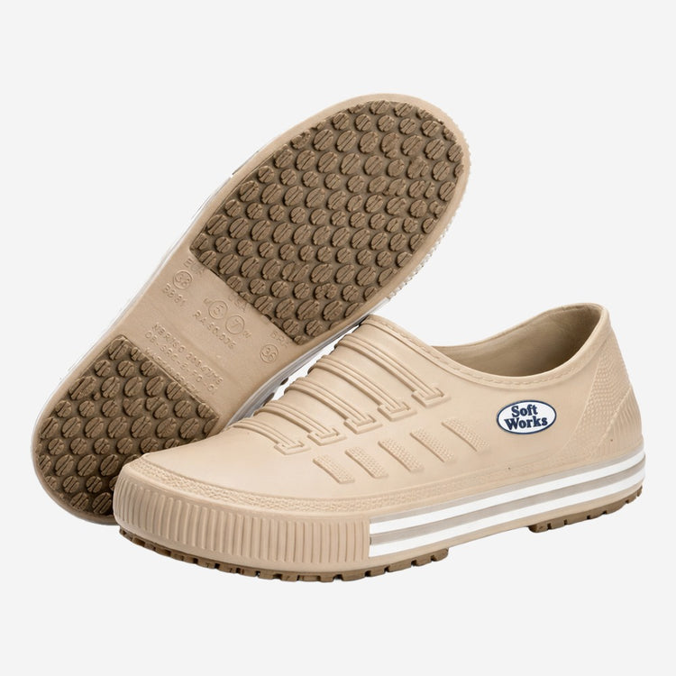Calçado ocupacional básico (OB), modelo baixo constituída de EVA (Etileno Vinil Acetato), desenho do cabedal tipo "A", montagem sistema injeção por expansão na cor branca, Classificação (II – Inteiro Polimérico), solado de borracha na cor bege sem ressaltos. Região do salto totalmente fechado, com resistência ao scorregamento SRC.