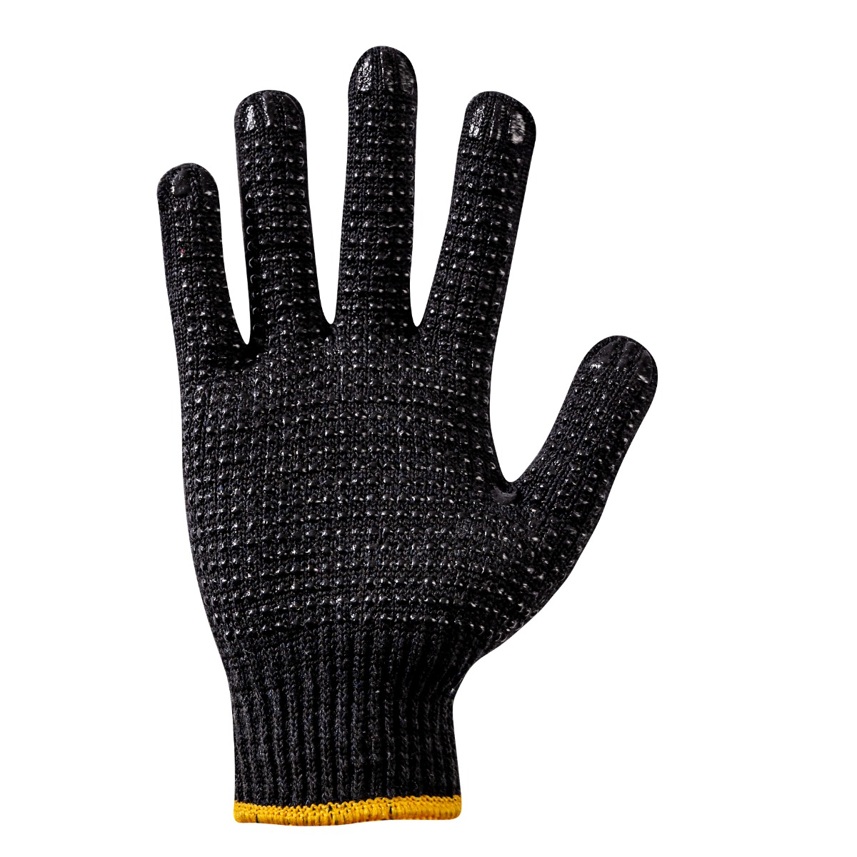 Luva de segurança tricotada em fibras sintéticas, revestimento em borracha natural antiderrapante na palma, face palmar dos dedos e ponta dos dedos, punho tricotado nas mesmas fibras, acabamento em overloque.