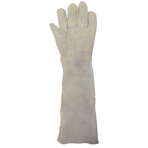 Luva de segurança confeccionada em malha de aramida, forro de malha de algodão cru e punho de raspa.