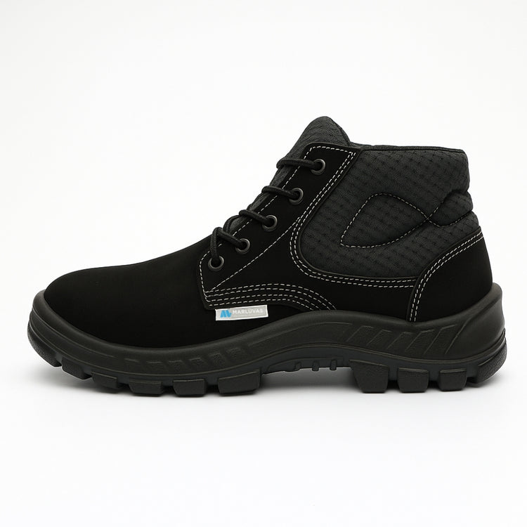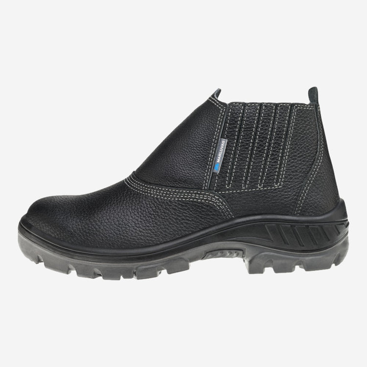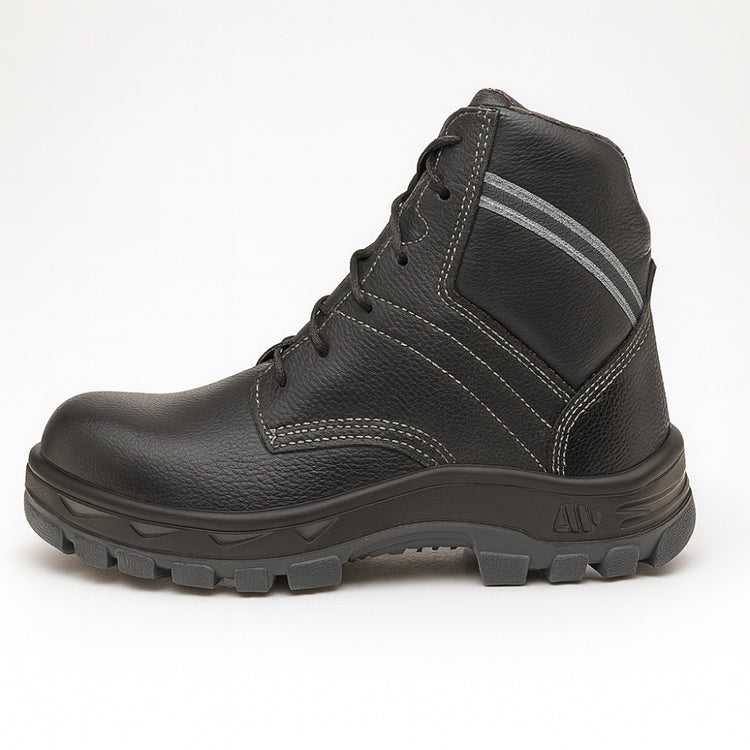 Calçado de segurança tipo botina, fechamento em cadarço, confeccionado em couro, colarinho em material têxtil, forro em tecido, palmilha de montagem em material têxtil fixada pelo sistema strobel, palmilha interna removível, biqueira de composite, solado de borracha colado e blaqueado, resistente à absorção de energia na área do salto e ao óleo combustível.