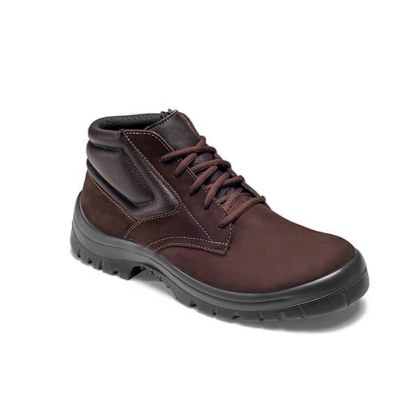 Calçado ocupacional de uso profissional tipo botina, cabedal confeccionado em couro, colarinho em material têxtil, forro da gáspea em não tecido, forro lateral em tecido, fechamento em velcro, palmilha de montagem em nãotecido fixada pelo sistema strobel, biqueira plástica para conformação e solado de poliuretano antiderrapante injetado diretamente no cabedal.
