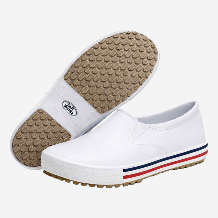 Calçado com resistência ao escorregamento em piso de cerâmica contaminado com lauril sulfato de sódio (detergente) (SRA).